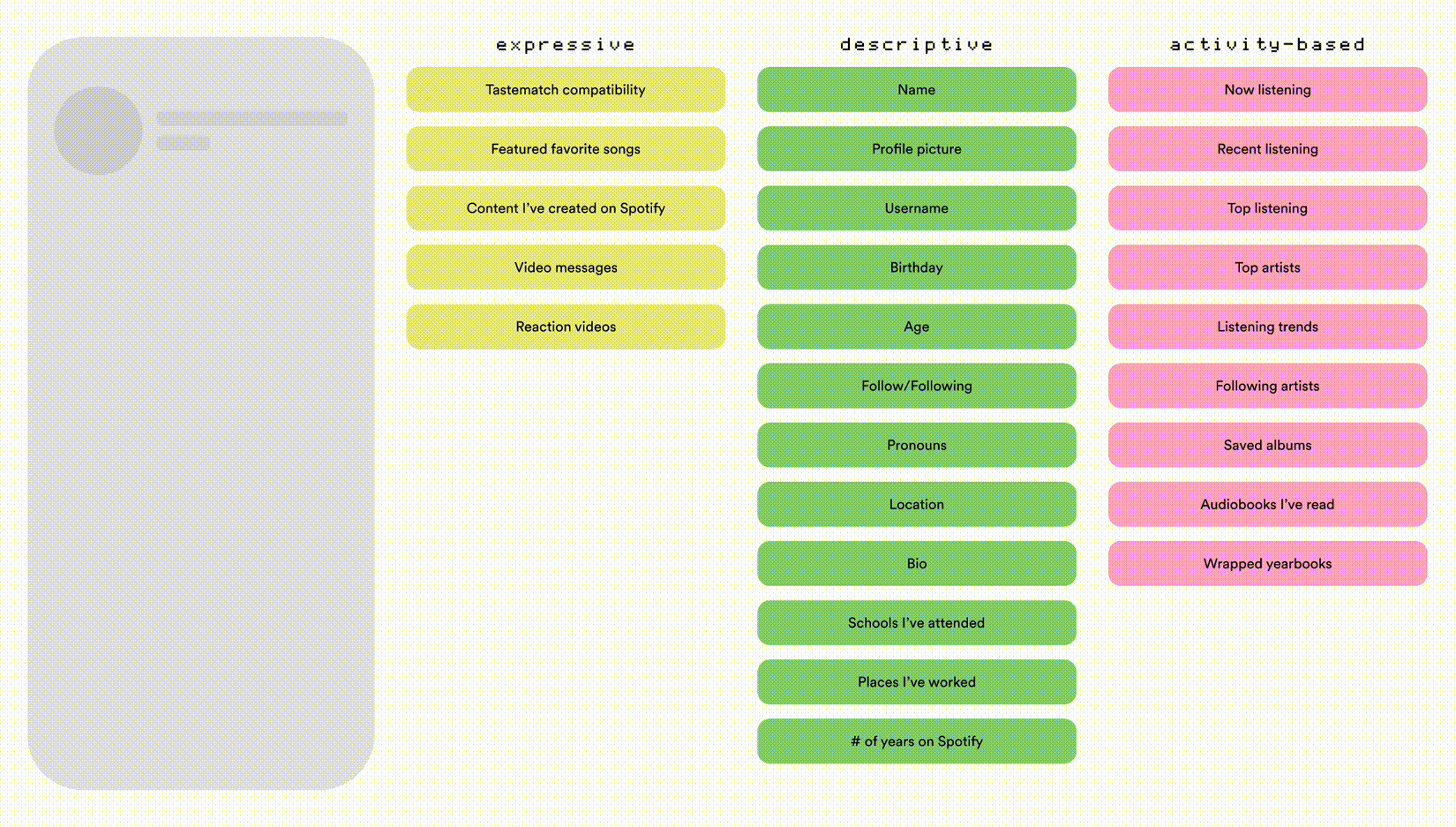 We worked with UXR to set up a study exploring user expectations of the profile. Users were given a blank profile, alongside a set of potential features & asked to rank the top 10 features they believed the profile should include. While there was a range of reactions to our more exploratory features, consistent amongst our testers was an perception of basic descriptive features as essential.