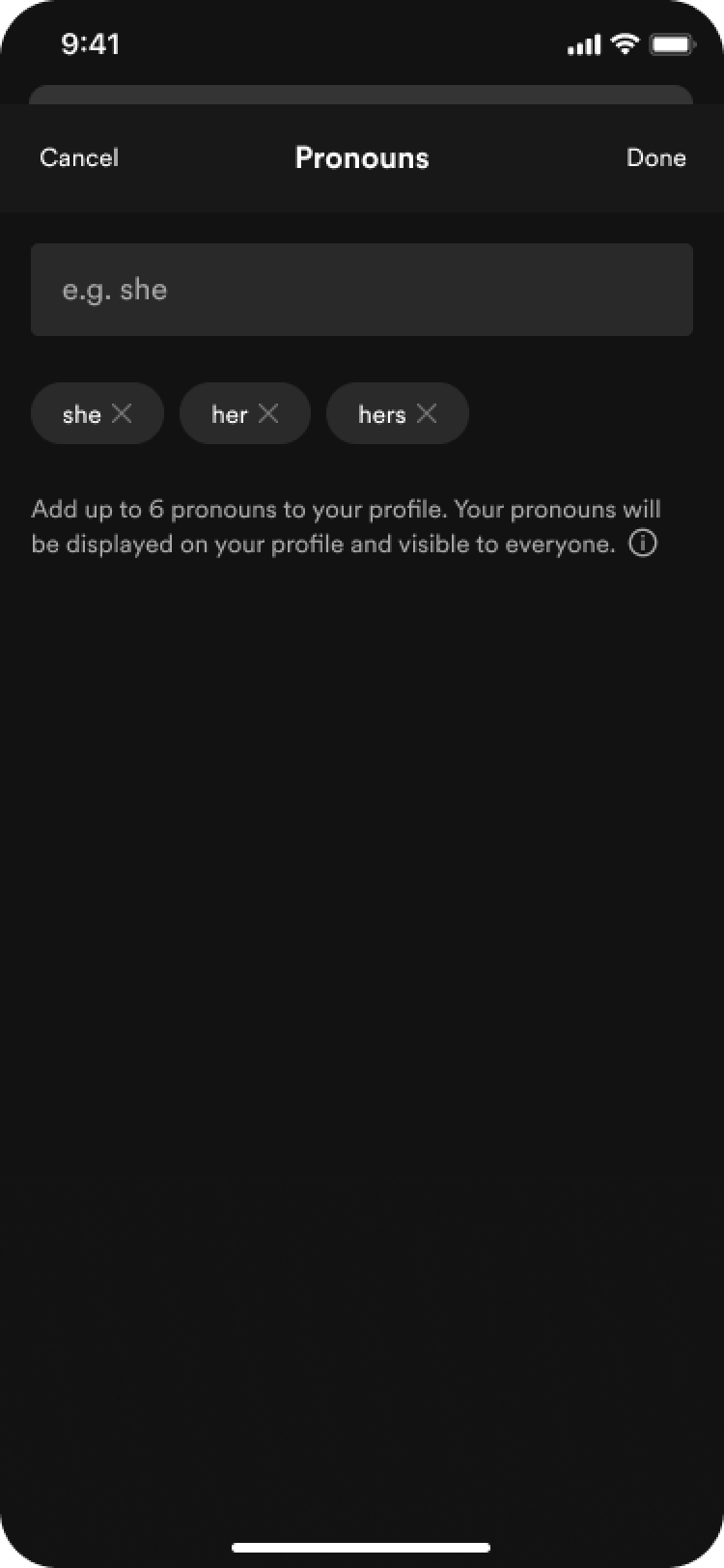 The next priority is pronouns, recognizing such as a meaningful expression of identity that’s lightweight to implement and important to support